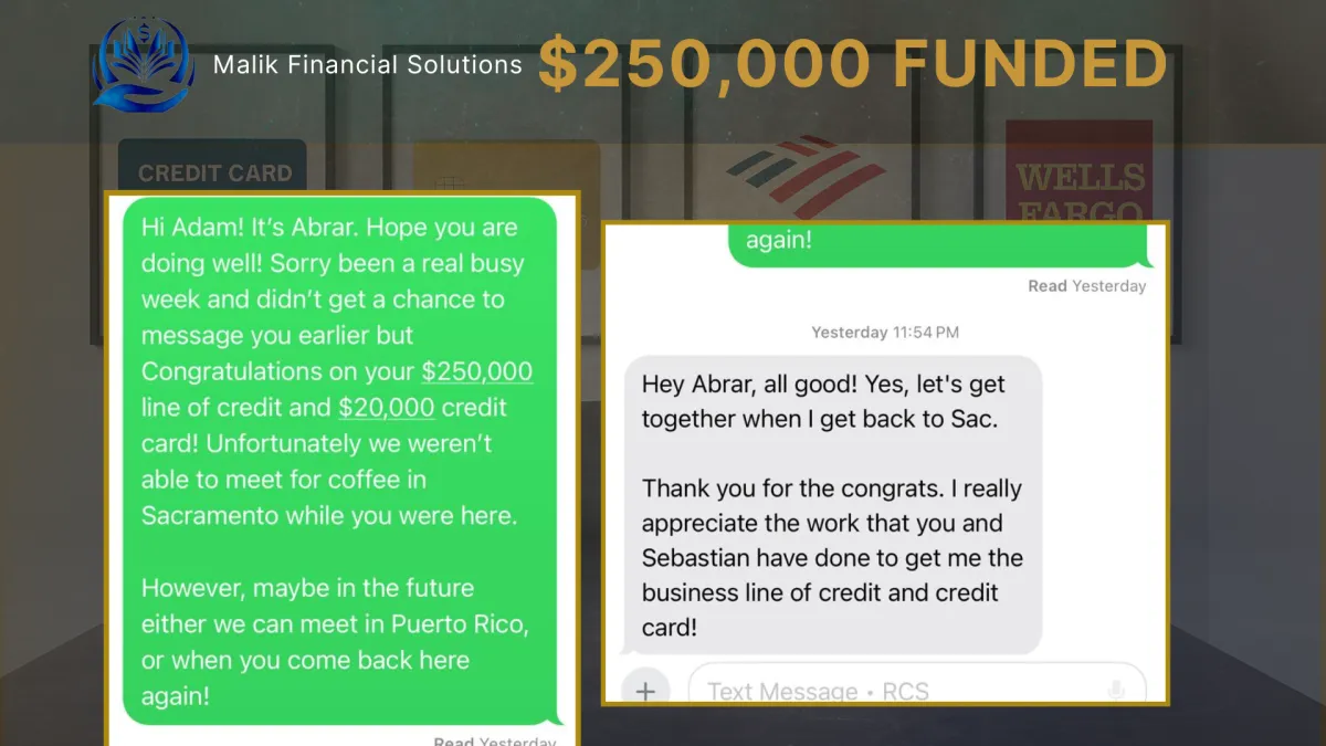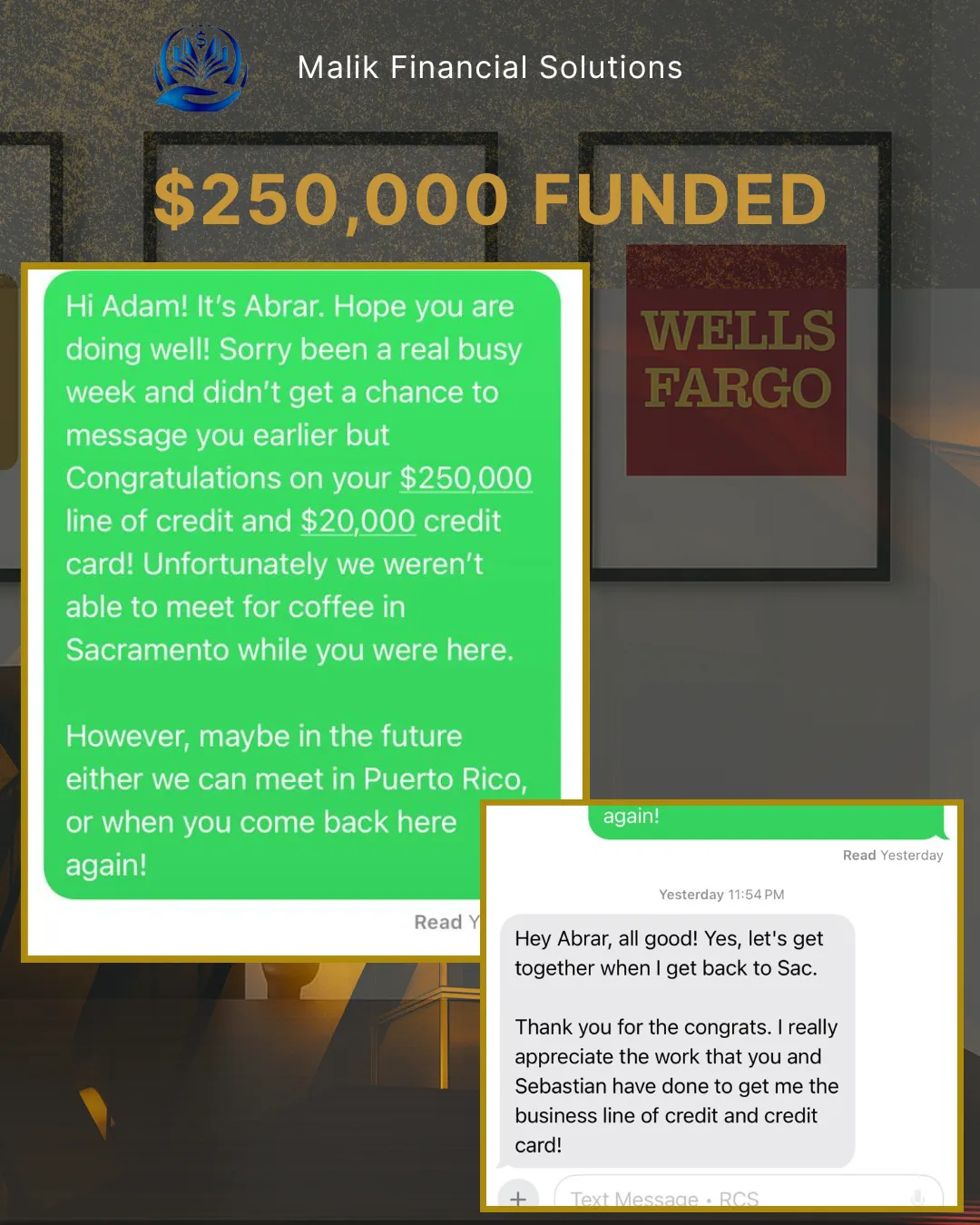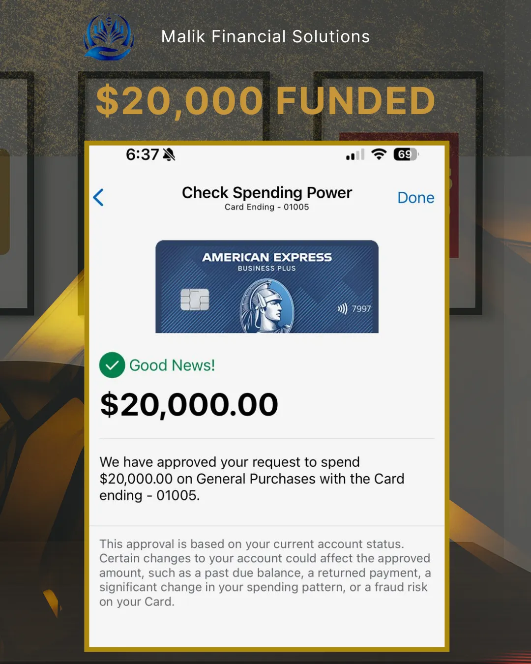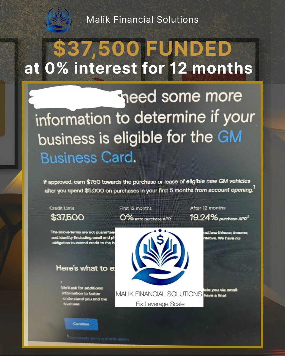 From Denied Loans to Approved! “Securing funding felt overwhelming until I worked with Malik Financial Solution. They helped me get approved for a $250,000 line of credit and a $20,000 business credit card. The process was straightforward, and their guidance made everything stress-free. This funding is already helping me scale my business faster than I imagined.”