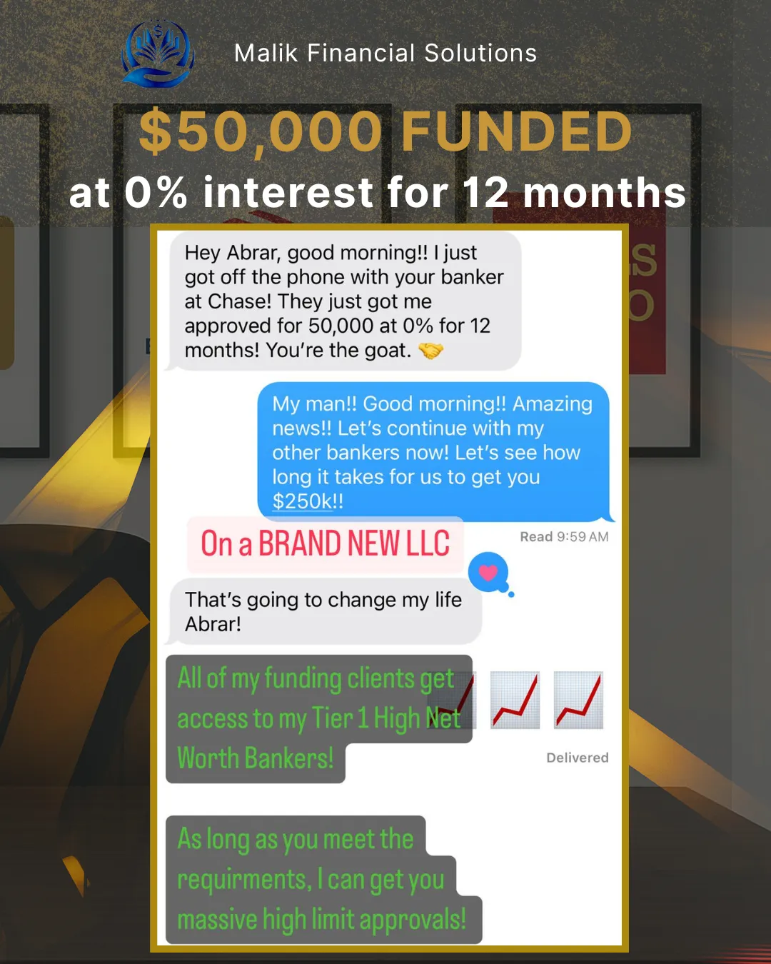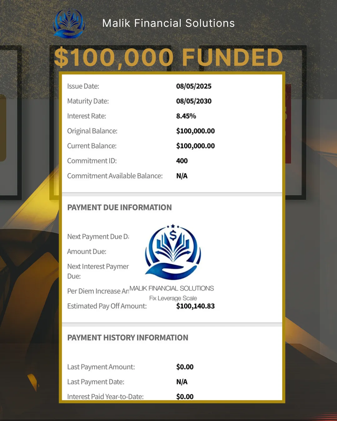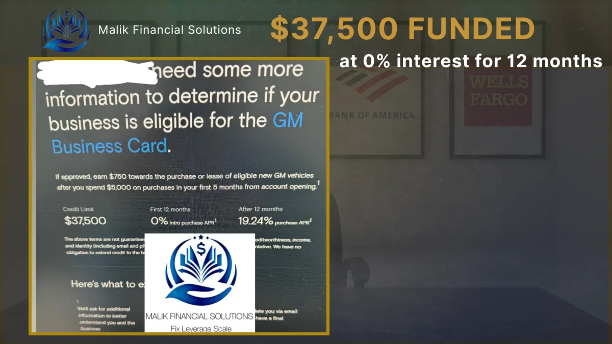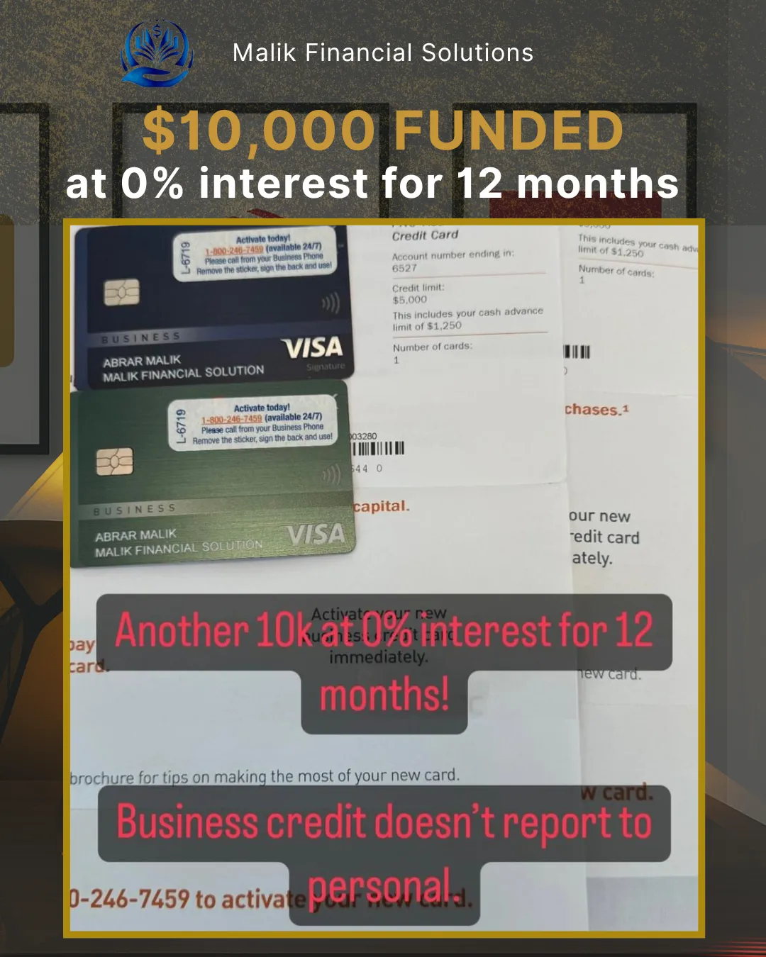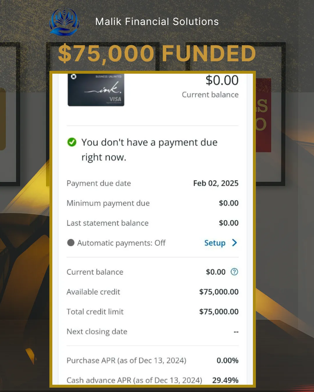 From Denied Loans to Approved! “Securing funding felt overwhelming until I worked with Malik Financial Solution. They helped me get approved for a $250,000 line of credit and a $20,000 business credit card. The process was straightforward, and their guidance made everything stress-free. This funding is already helping me scale my business faster than I imagined.”