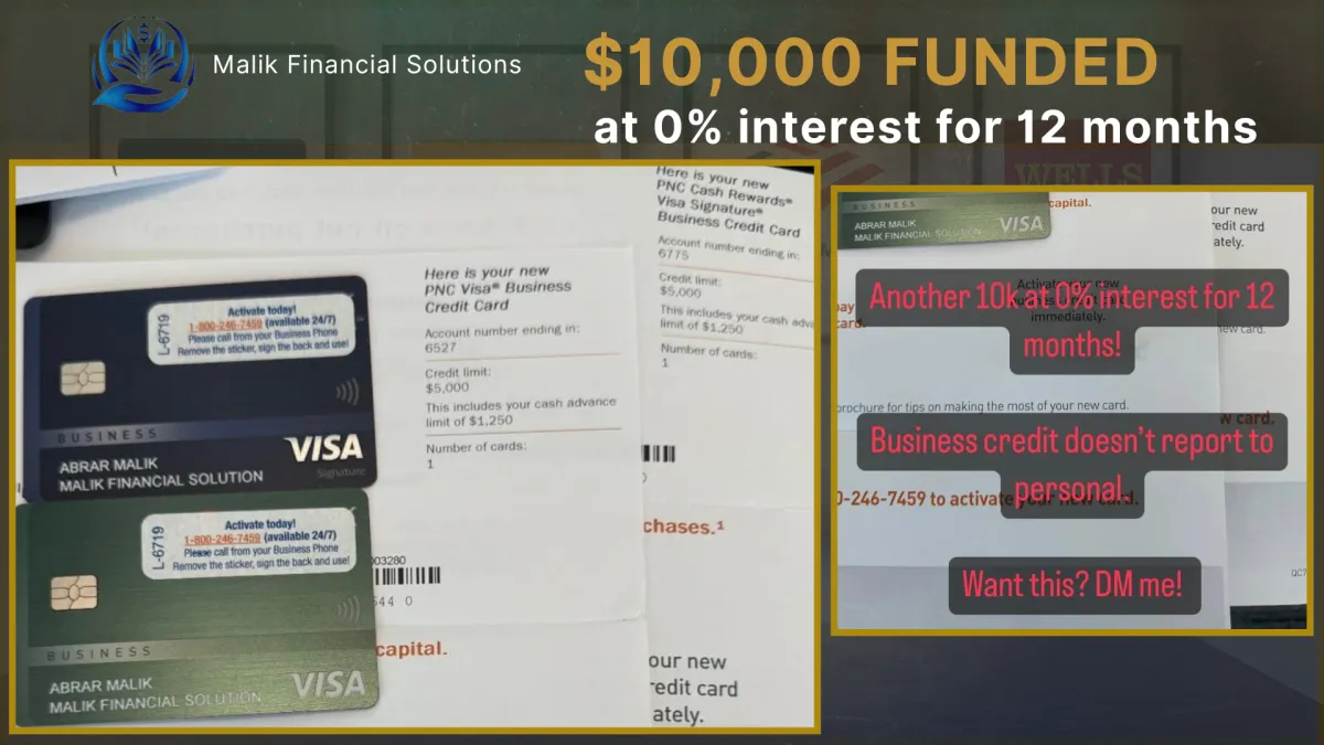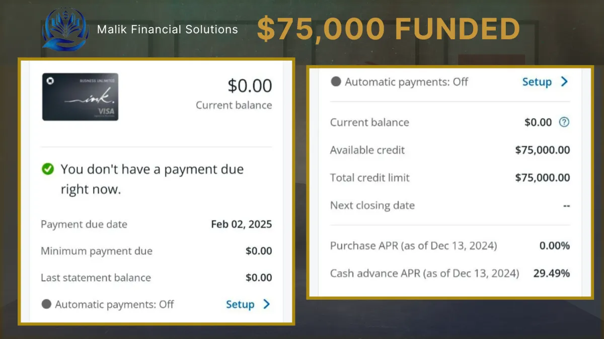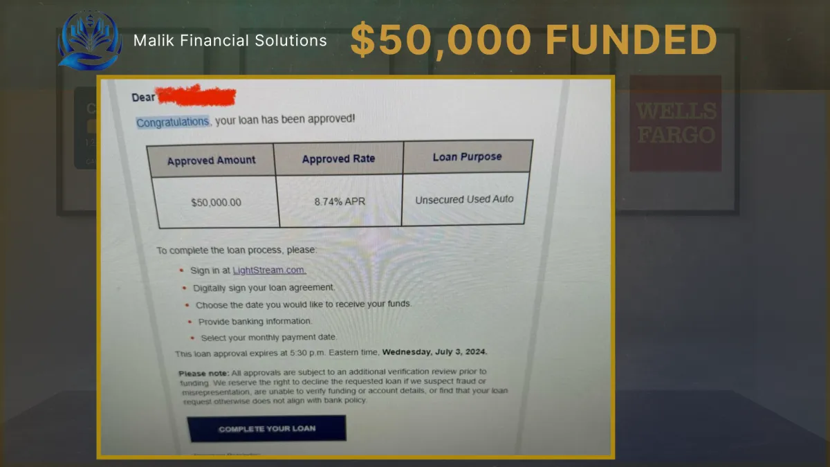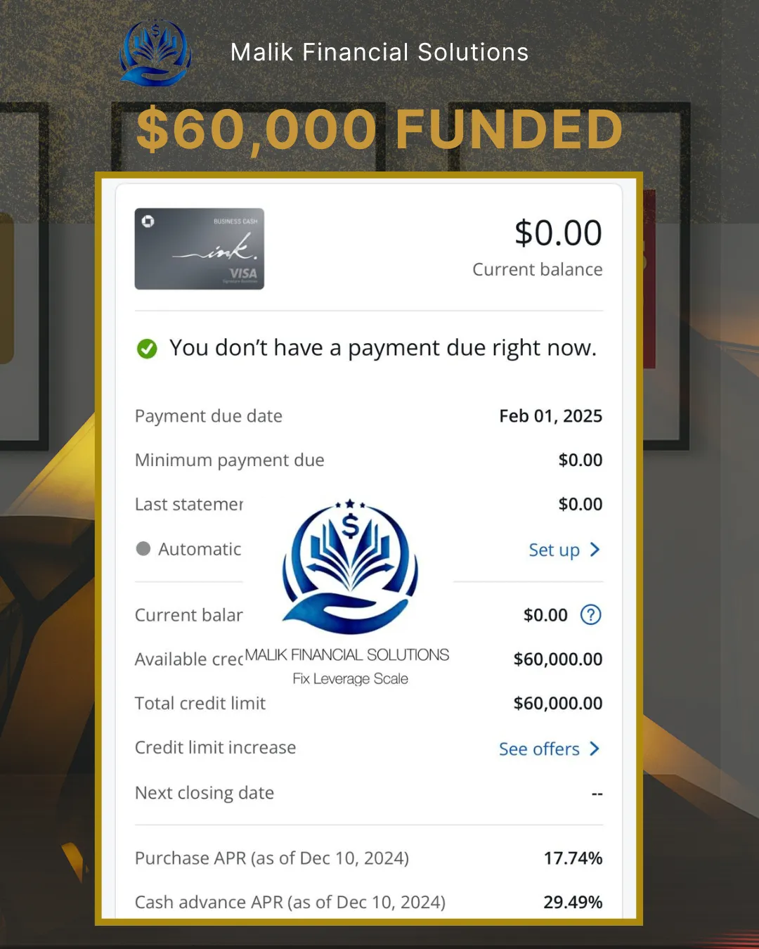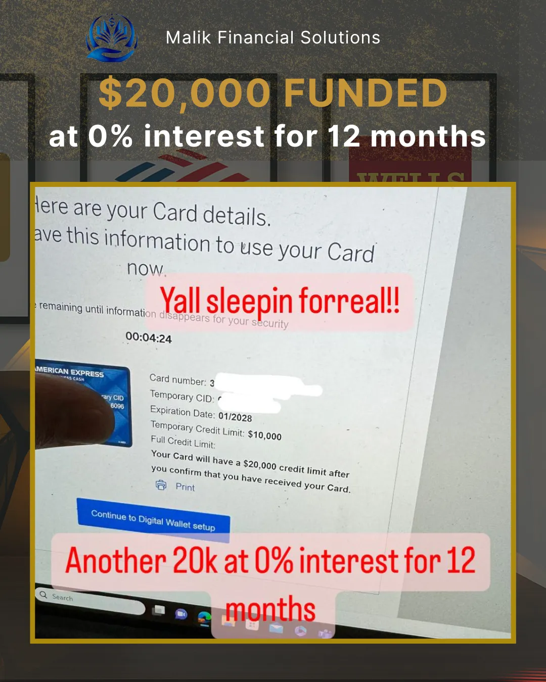 From Denied Loans to Approved! “Securing funding felt overwhelming until I worked with Malik Financial Solution. They helped me get approved for a $250,000 line of credit and a $20,000 business credit card. The process was straightforward, and their guidance made everything stress-free. This funding is already helping me scale my business faster than I imagined.”